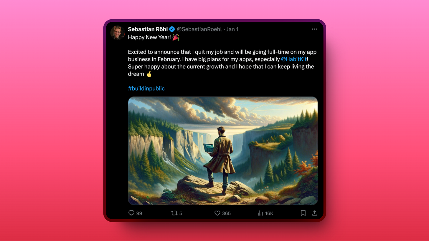 On the first of January, I announced on X that I quit my job again. Let me give you a quick recap of my journey so far. At the start of 2022, I was burnt out from my job as a Software Engineer and decided to quit my job to pursue a dream: building a profitable app business within a year. I gave myself 12 months to make it happen and started working on my apps. After seeing no success for a long time with my first app (liftbear.app), I launched my second app HabitKit in November 2022. This was the moment when everything changed and I suddenly started making money. It wasn't enough to live off of, that's why I went back to my old job in April of 2023 again.